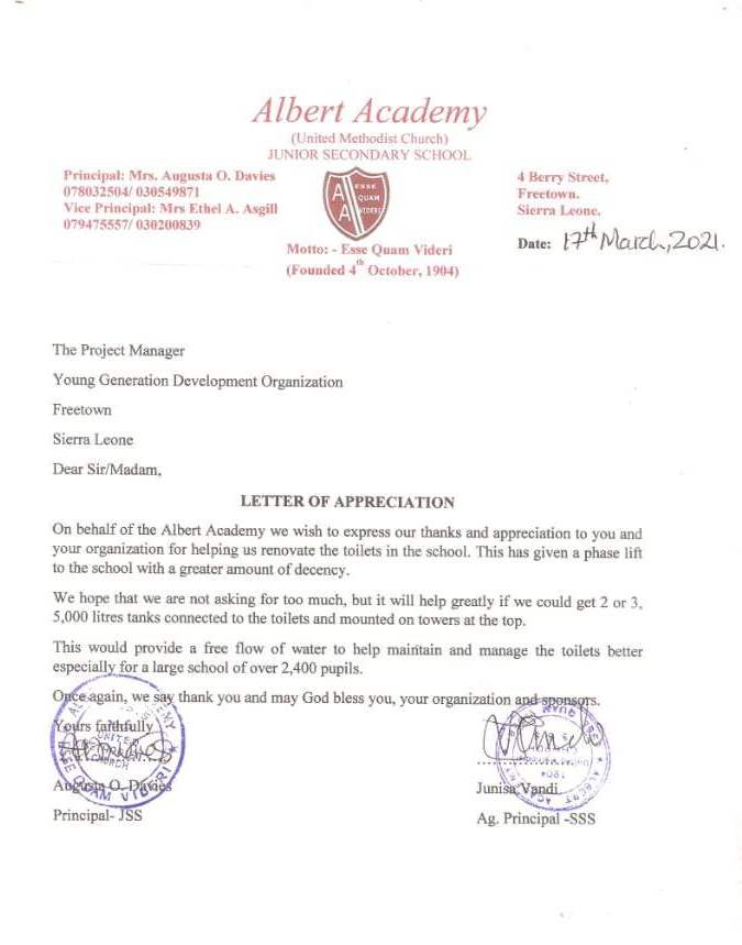 Das Projekt hat in einem der ärmsten Länder der Welt, in Sierra Leone stattgefunden. Die Schule Albert Academy in Freetown ist von der essenziellen Bedeutung für die einheimische Bevölkerung. Sie bietet Platz für 2500 Schüler. Vor Projektbeginn waren schlimmste hygienische Verhältnisse der Toiletten- und Sanitäranlagen in der Schule vorzufinden. Die Bilder spiegeln den extrem miserablen Zustand jedoch nur unzureichend wieder. Darüber hinaus war die Anzahl der Toiletten für Kinder und Lehrer unzureichend.